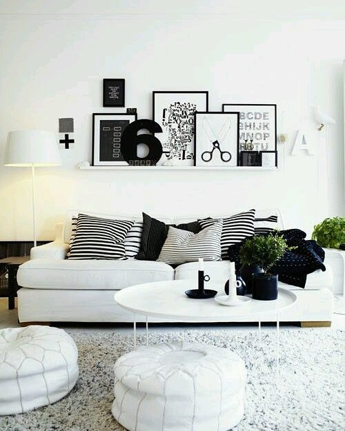 Crisp white dominates the space, contrasted by striking black accents for a chic aesthetic. An eclectic gallery wall of framed artworks introduces a playful edge, while striped cushions on the couch add pattern without overwhelming the simplicity. Moroccan poufs below serve both as seating and artistic elements, enhancing the room’s dynamic style.