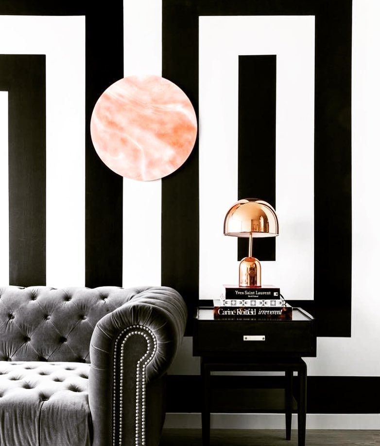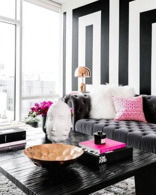 Vertical black stripes on white walls create a bold, elongating effect in this living room. A Chesterfield sofa anchors the space with its classic charm, while vibrant pink accents introduce a playful twist. A sculptural headpiece and copper lamp infuse the decor with artistic elegance, adding warmth to the monochrome scheme.