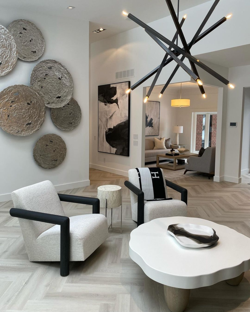 This black and white living room transforms into a modern art gallery, with abstract art pieces adorning the walls. Neutral tones provide a versatile backdrop, while an innovative, sculptural light fixture adds dimension. The monochromatic pillows enhance the curated collection, and bold black accent chairs anchor the space, showcasing refined elegance.