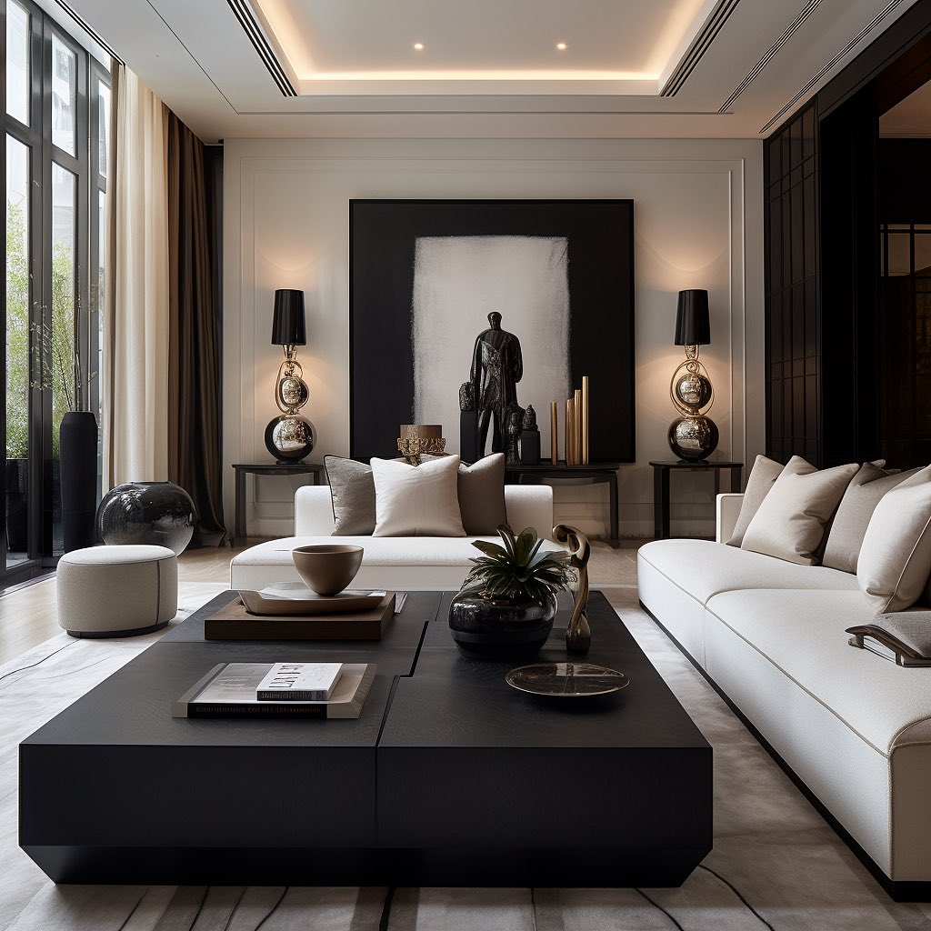 Symmetry and clean lines define this living room, achieving a harmonious balance. A large-scale black and white painting creates a commanding backdrop, while elegant table lamps and a statuesque figure add sophistication. Plush cream sofas offer relaxation, contrasting beautifully with the dark, oversized coffee table.