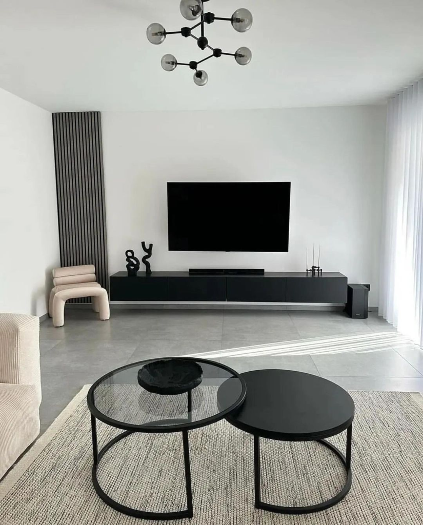 This living room epitomizes sleek minimalism through clean lines and uncluttered design. Circular black coffee tables add a sculptural element, while a singular striped column creates a unique focal point. The modern sputnik chandelier introduces a mid-century twist, complementing the contemporary aesthetic.
