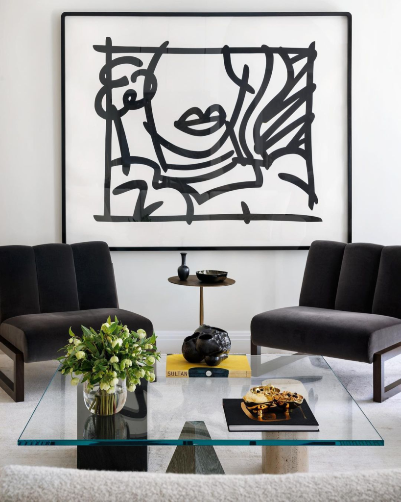 A large, abstract black line art piece dominates the space, offering a striking visual impact. Sleek, dark armchairs echo the strong lines of the artwork, while a glass coffee table with black accents provides a transparent centerpiece. Fresh greenery and intriguing sculptures add life and texture, enhancing the minimalist chic decor.
