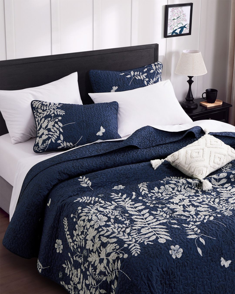 Dive into the serene depths of night with a navy blue bedding set. Subtle botanical embroidery adds an elegant contrast. Complement with soft white pillows for a crisp, clean finish, creating a sophisticated and tranquil bedroom.