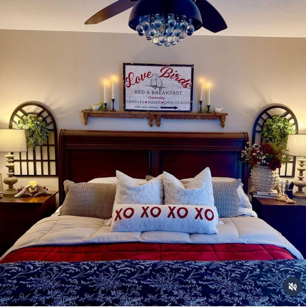 Create a romantic ambiance with navy and white bedding complemented by ‘XO’ decorative pillows. Warm lighting and candles set a cozy mood. Add a ‘Love Birds’ sign for a whimsical note, perfect for a love-inspired bedroom design.