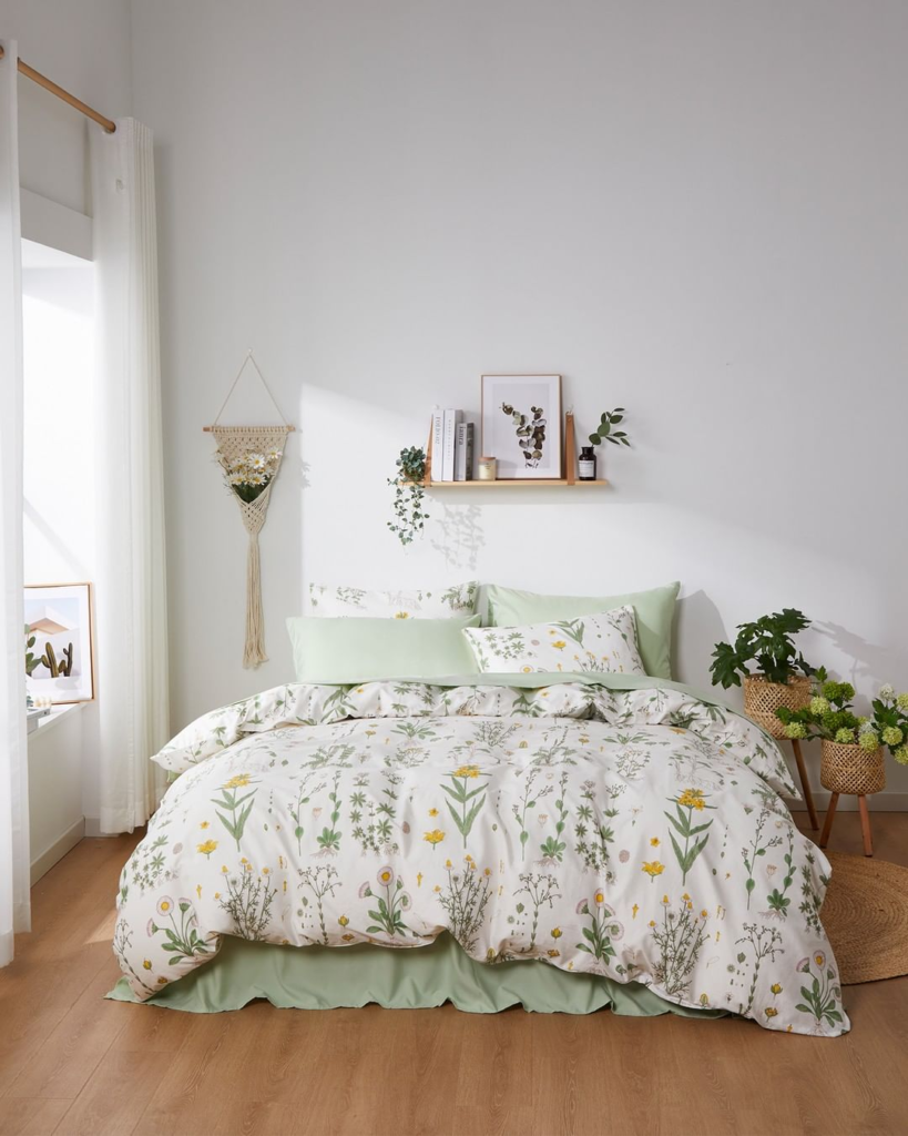 Create a peaceful haven with a botanical print duvet cover in soft greens and neutrals. Matching pillow shams provide a unified look, while potted plants enhance the natural vibe. Ideal for a calm, minimalist bedroom.
