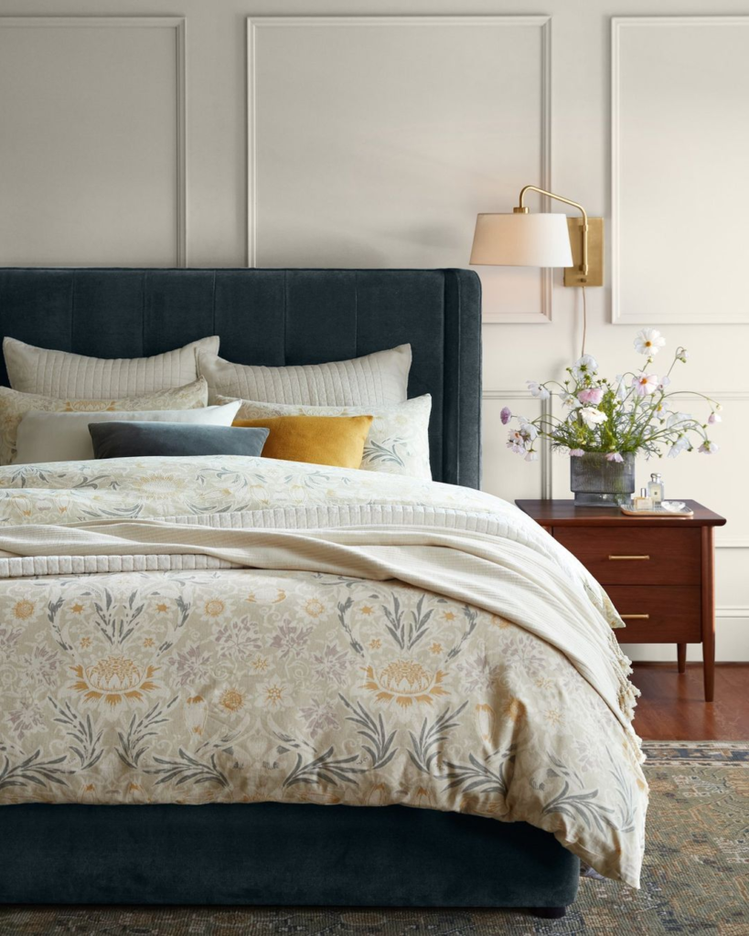 Indulge in elegance with a floral-print comforter in soft, muted tones against a plush navy headboard. Mix in striped and solid pillows for texture variety. A brass bedside lamp adds a modern touch, perfect for a luxuriously cozy bedroom retreat.