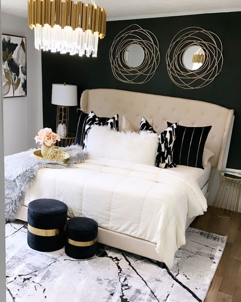 Achieve a modern glam look with creamy white bedding and striking black accents. Plush textures and bold patterns, like cowhide and geometric pillows, make a statement. Gold accents and a dramatic chandelier elevate the sophistication, perfect for a chic and polished bedroom.