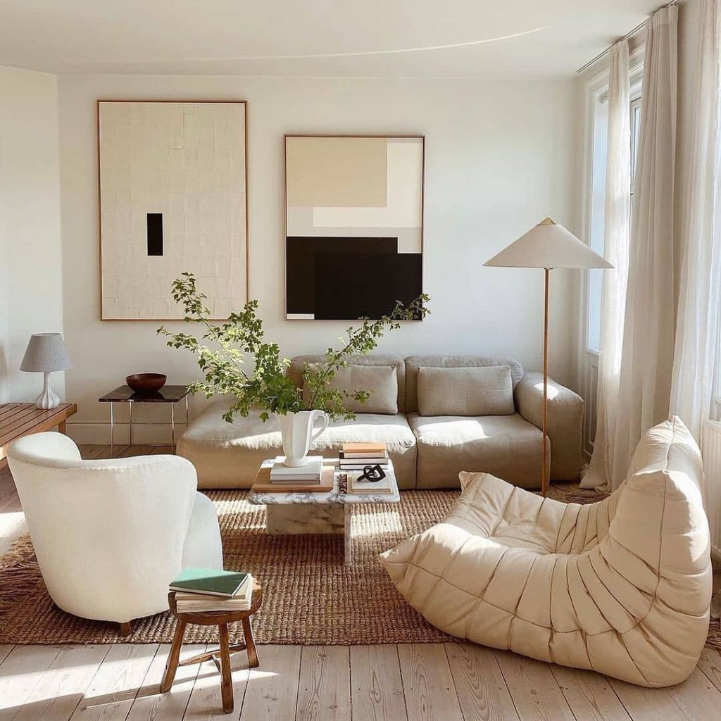 This living room features a soothing mix of earth tones that create a calming retreat. The beige sectional and creamy white armchairs blend seamlessly, exuding tranquility. Soft, diffused natural light through sheer curtains highlights the wooden accents and jute rug, showcasing the understated beauty of nature-inspired colors.