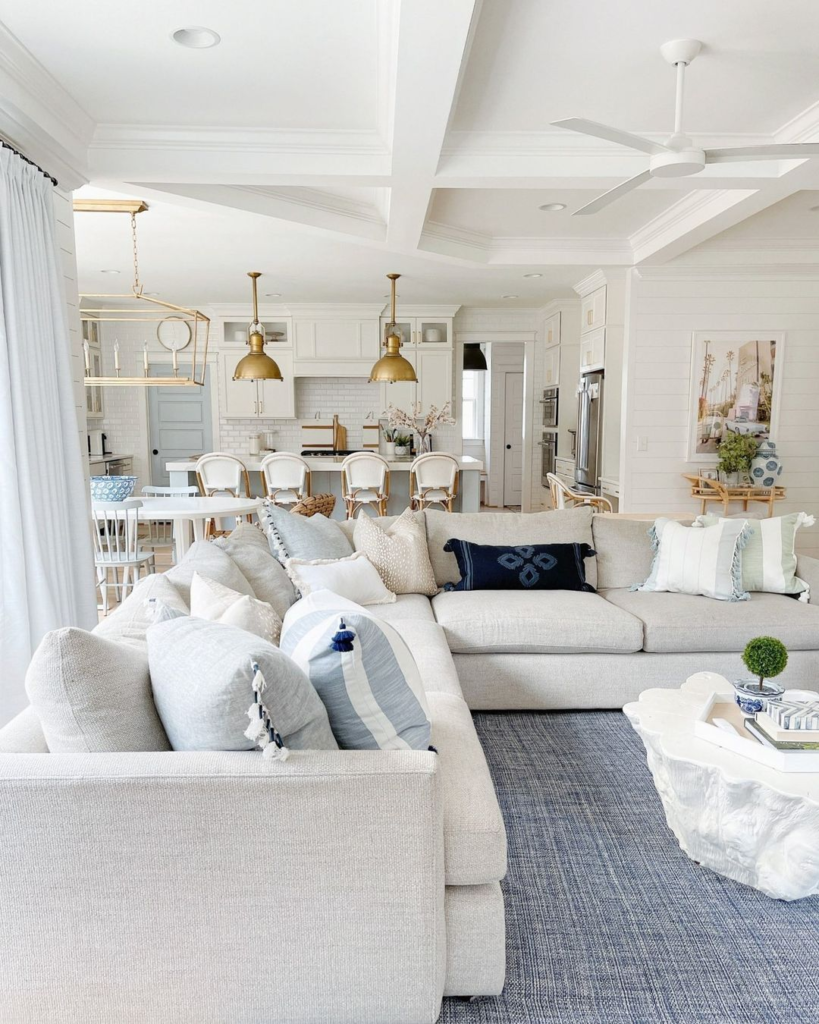 The open-plan layout merges sandy neutrals with oceanic blues, while gold pendant lighting introduces a touch of warmth. Comfortable textiles and inviting seating arrangements encourage relaxation and social gatherings. This design effortlessly blends coastal influences with stylish earth tones.