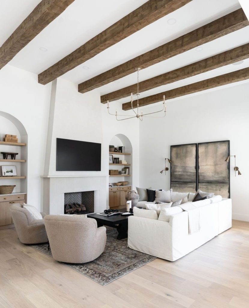 Exposed wooden beams lend a rustic charm to the modern setting, complemented by a sleek, contemporary fireplace. Luxurious, textured seating contrasts with the room’s sleek monochrome elements. Artwork and decorative accents subtly nod to an earthy theme, combining rustic charm with modern comfort.
