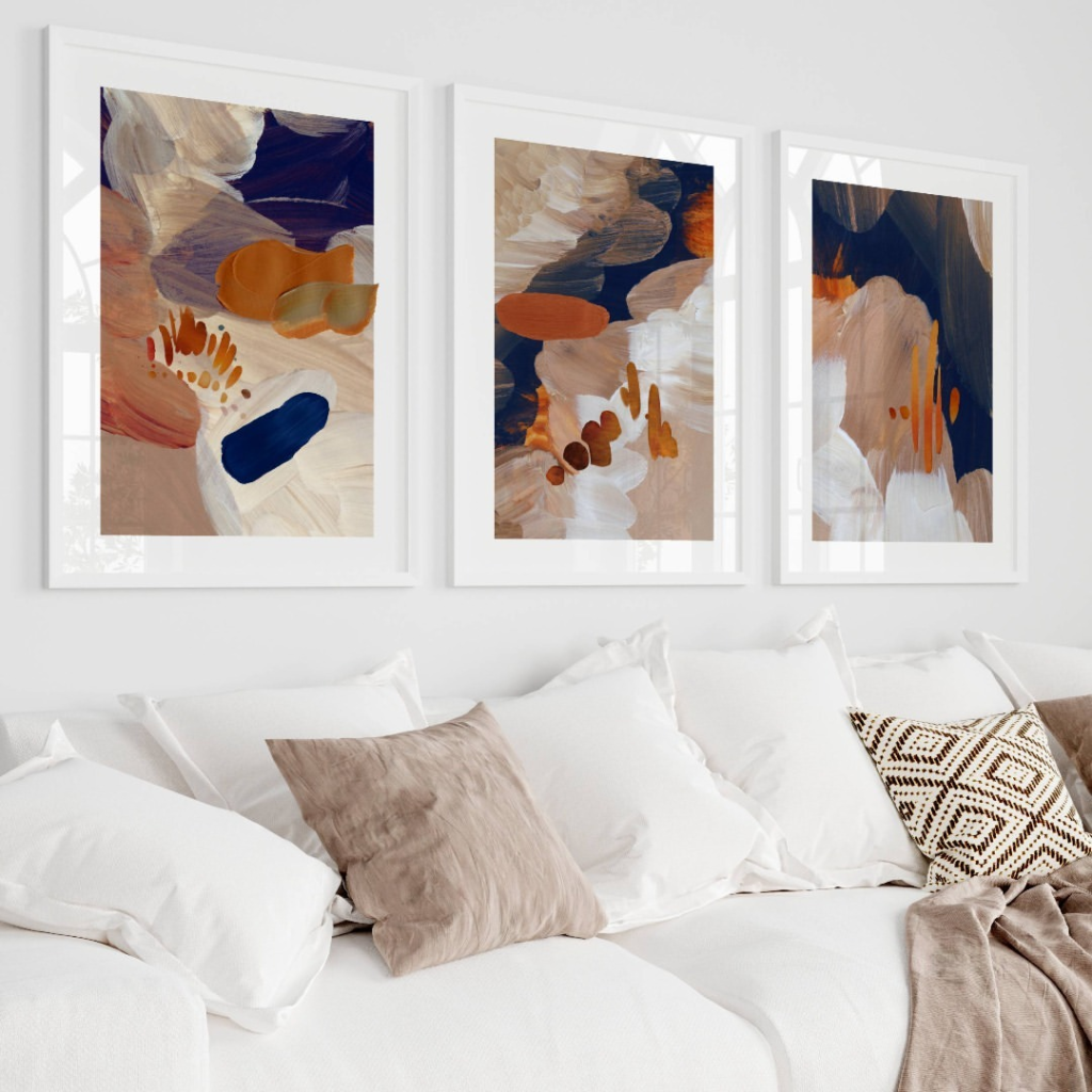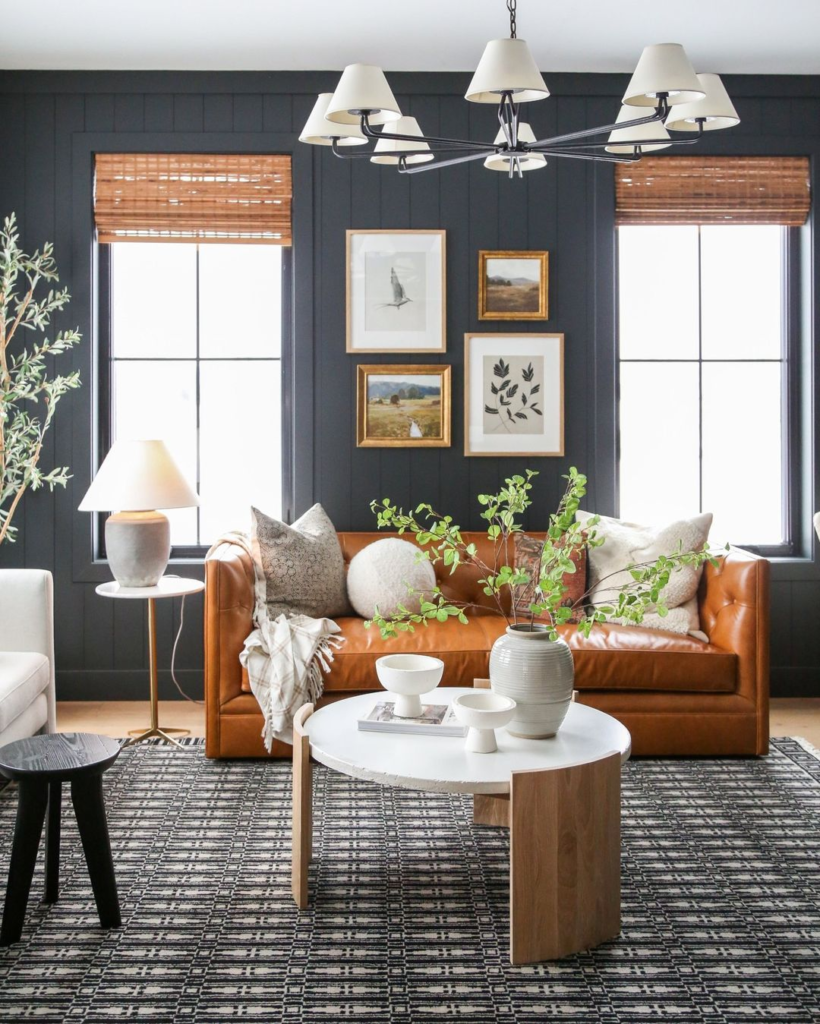 Deep charcoal walls form a dramatic backdrop for the earthy-toned gallery wall. A caramel leather sofa adds warmth and richness, while textured accents and greenery soften the bold contrasts. This composition offers a cozy, yet dynamic, aesthetic perfect for enthusiasts of earthy tones.