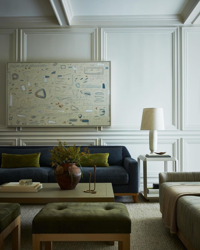 Muted wall paneling provides a refined backdrop for eclectic artwork, while olive green accents bring a touch of earthy sophistication. The navy sofa and textured ottomans offer both style and comfort. This space elegantly blends classic design with rich, earthy hues.
