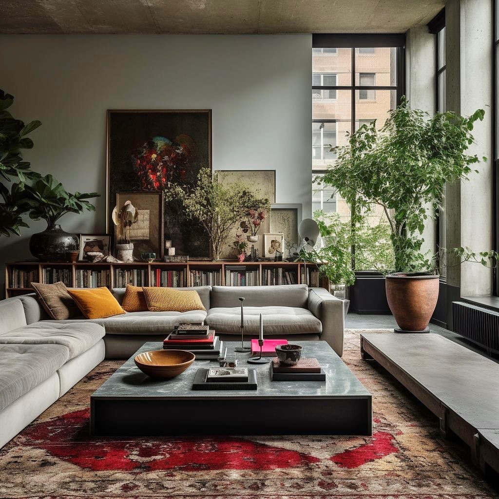 Lush greenery livens up this industrial-style space, with mustard yellow cushions adding a vibrant pop. A bold patterned rug anchors the room with energetic tones. The fusion of concrete, wood, and foliage creates an urban oasis that celebrates both nature and industrial design.