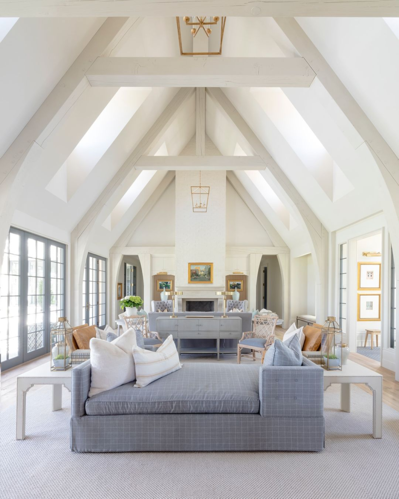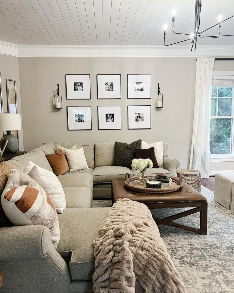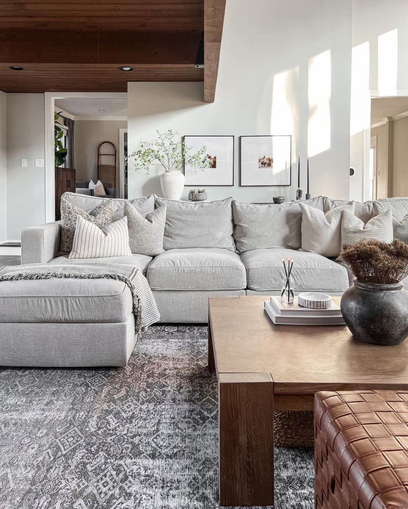 A sprawling gray sectional offers ample seating in a neutral-toned space. Warm wooden beams contrast with bright, high walls. A patterned rug and textured pillows add depth, blending sleek modernity with rustic undertones for a cozy, chic setting.