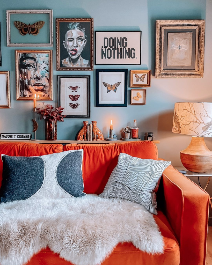 A bold terracotta sofa stands out against a tranquil blue wall, while varied textures and patterns adorn an eclectic art gallery. Cozy fur throws and vintage frames add warmth and character, marrying vibrant earth tones with a playful, serene ambiance.