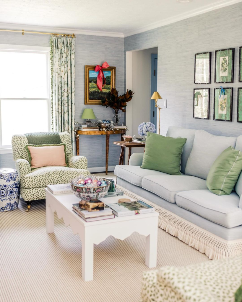 A soft blue couch blends with botanical prints, forming a nature-inspired sanctuary. Green pillows reflect the lushness of a garden, while a textured rug and rattan accents provide natural comfort. This room seamlessly combines soft pastels with earthy greens.
