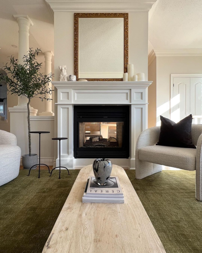 A classic fireplace, framed by a gilded mirror, reflects the room’s natural light. Olive green accents ground the airy cream palette, while modern furnishings and traditional architectural details blend seamlessly. This space harmonizes timeless elegance with earthy undertones.