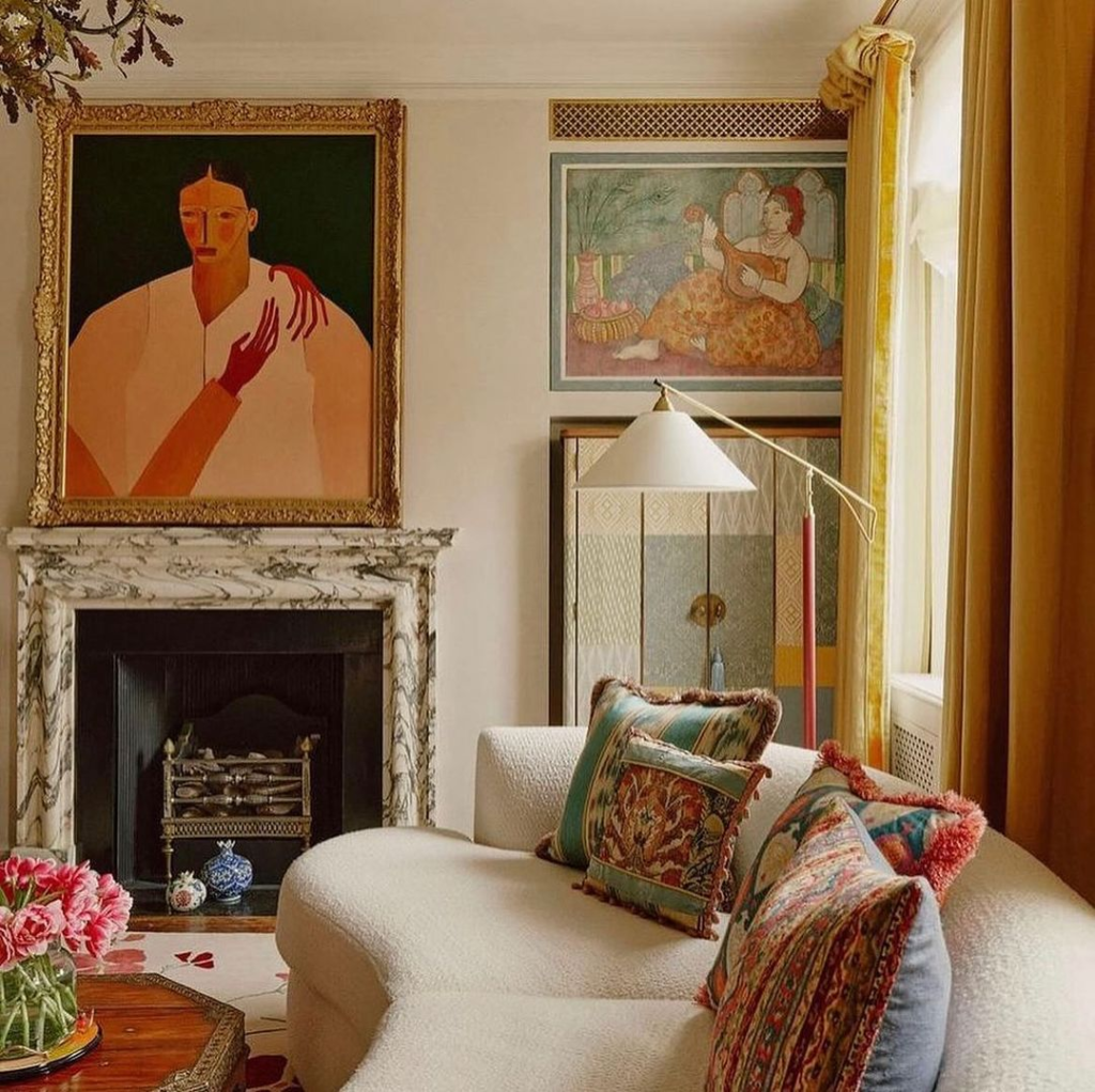 Bold earth-toned paintings celebrate artistic expression, contrasted by a classic marble fireplace. Patterned pillows add texture and color to the creamy sofa, creating a space where traditional charm meets vibrant, bohemian flair.
