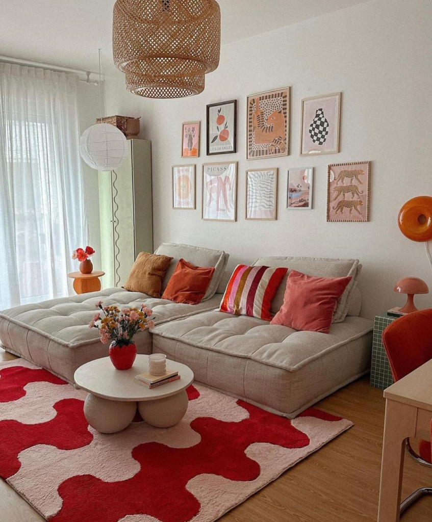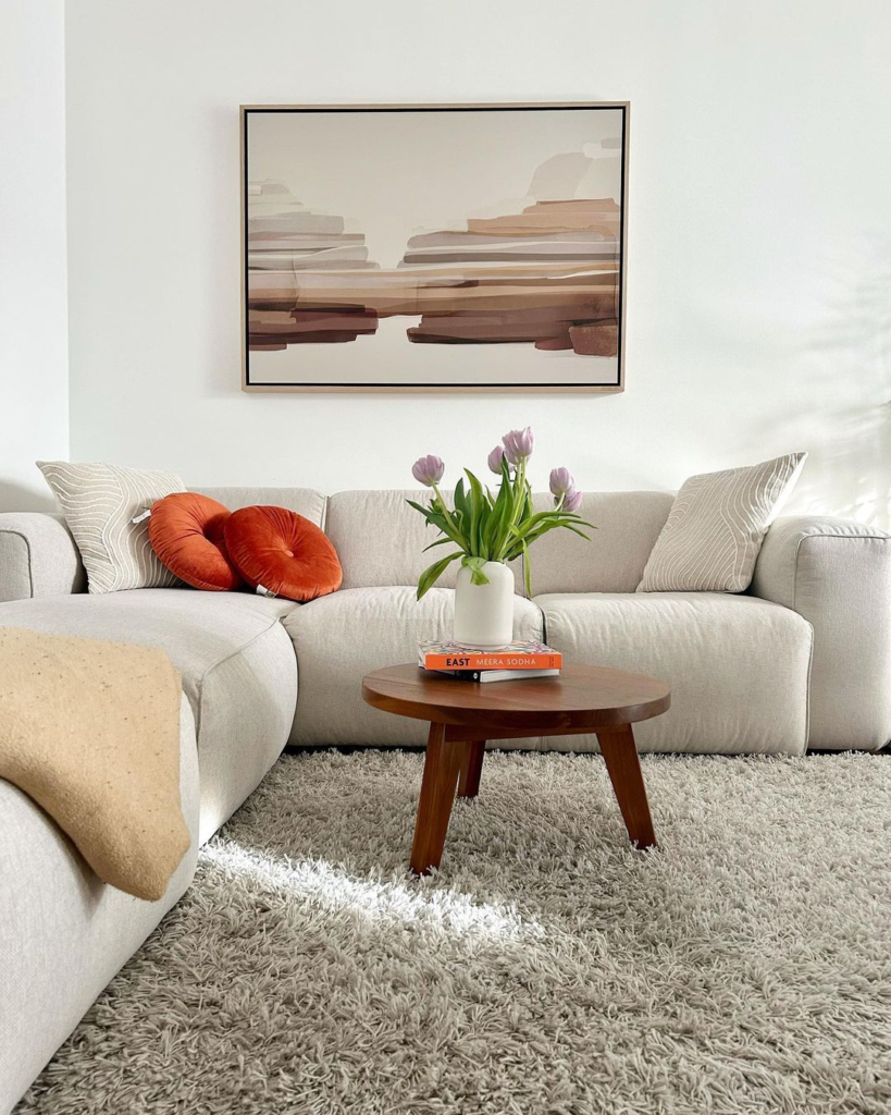 Abstract and geometric art injects playful character into the room’s warm palette. The plush beige sectional invites lounging, while bold red accents, like the rug, energize the serene space. This living room combines cozy comfort with vibrant design.