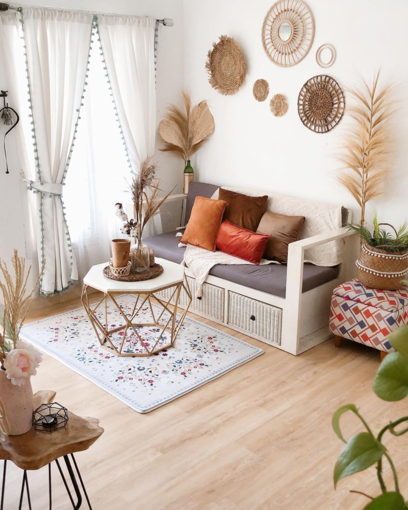 Woven wall hangings and dried pampas grass infuse a bohemian vibe into this earthy nook. Burnt orange cushions provide a warm pop of color, while a geometric coffee table and patterned rug introduce eclectic charm. This space merges global textures with earthy hues for a cozy atmosphere.
