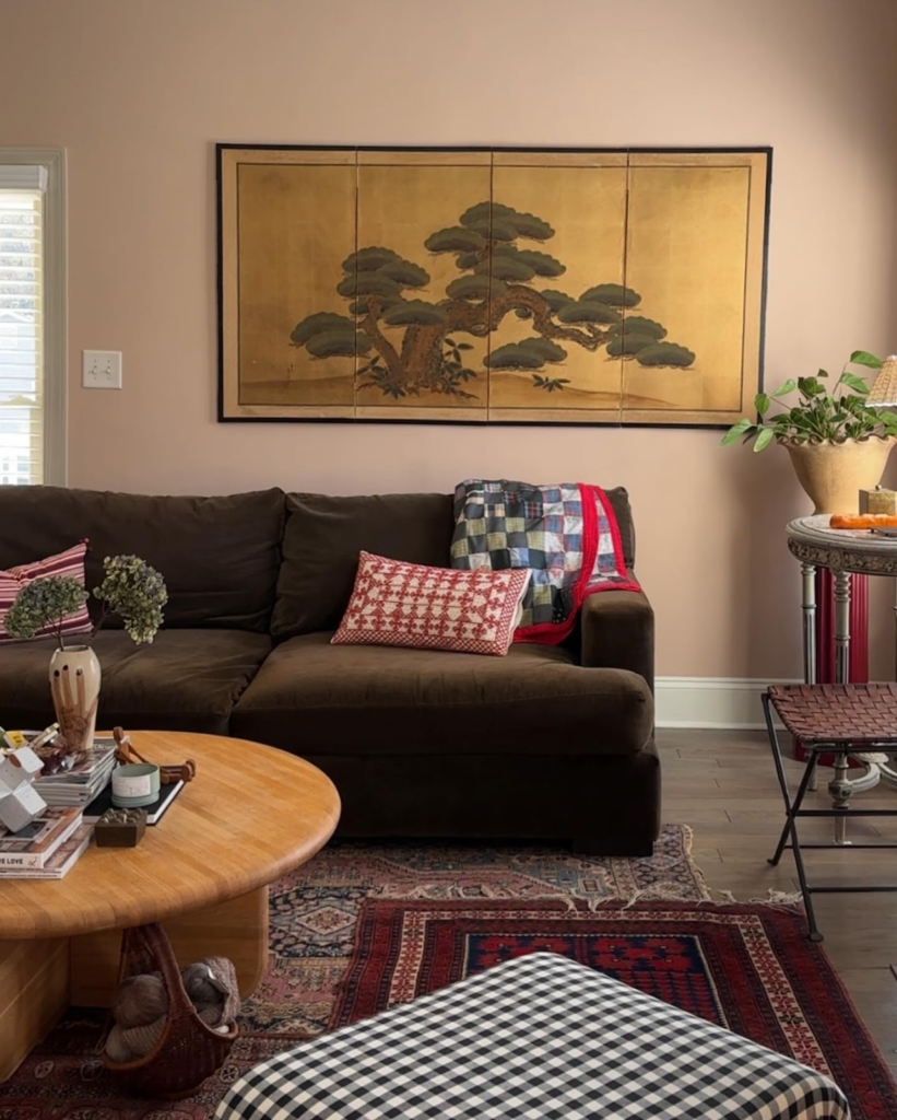 A triptych of classic tree artwork commands attention above a rich chocolate sofa. Traditional patterns on the rug and pillows blend with modern checks, merging eras seamlessly. The round wooden coffee table serves as a natural focal point, harmonizing traditional and contemporary elements.