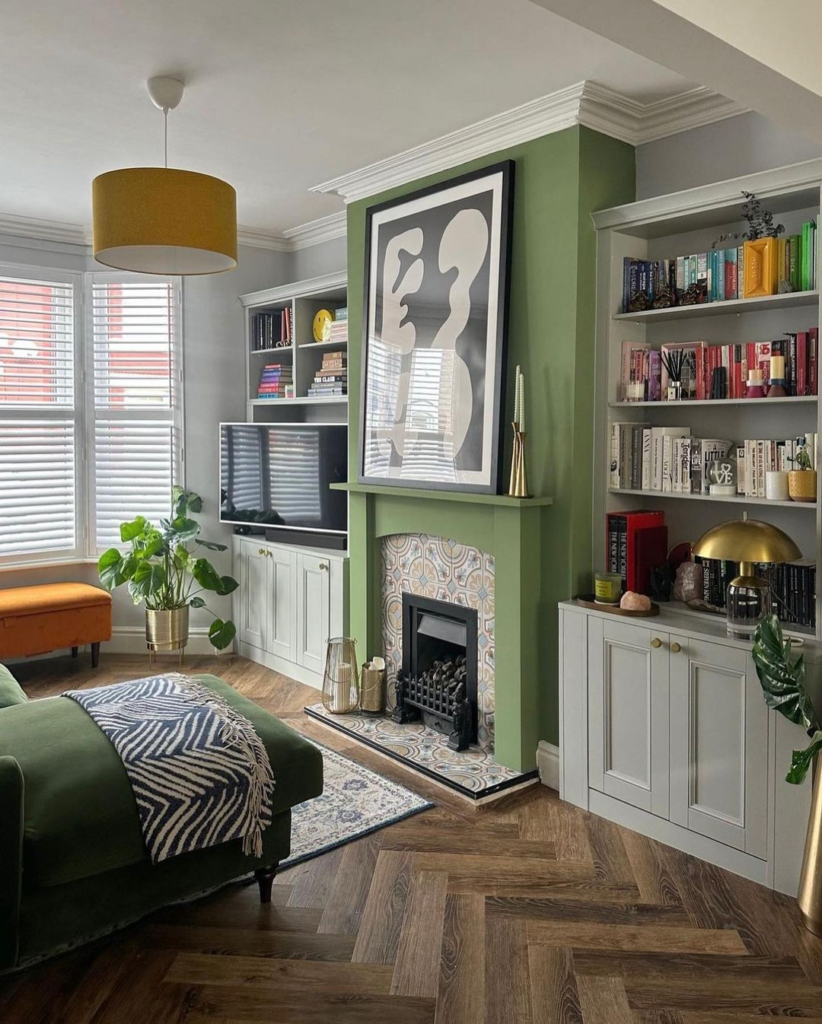 The olive green wall creates a rich backdrop for striking monochrome artwork. A mustard ceiling lamp adds vintage charm, while a traditional fireplace and patterned rug echo classic design. This room celebrates color by blending classic style with lively earth tones.