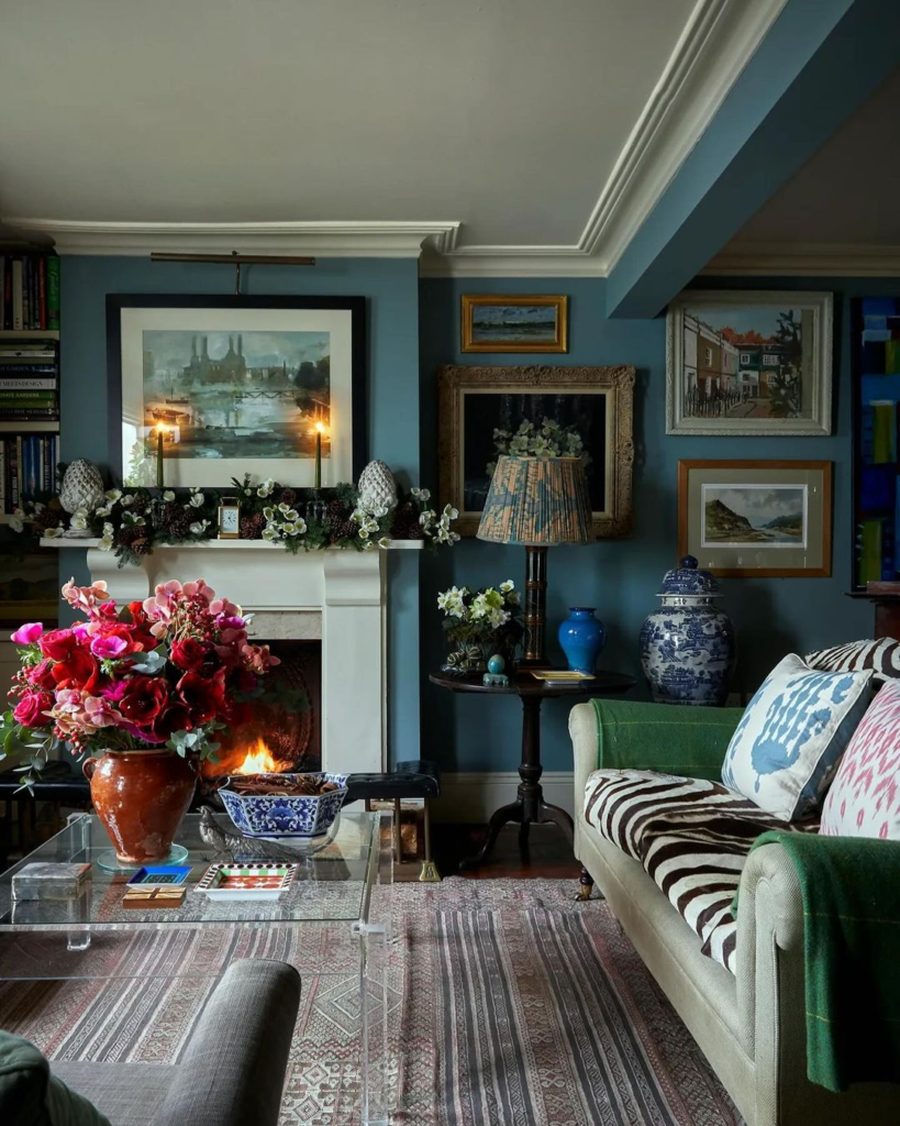 A roaring fireplace anchors the space amid eclectic frames and deep, earthy blues. Vintage furnishings and patterned textiles bring warmth and history, creating a curated blend of antique charm and cozy comfort.