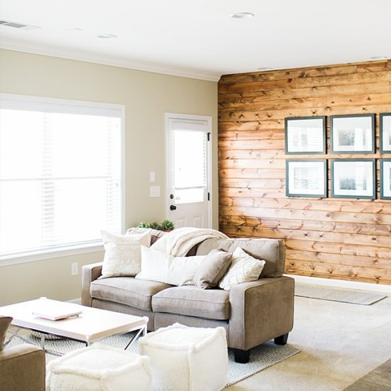A rustic wood accent wall adds cabin-like warmth to the space. Neutral furnishings complement the soft beige walls and natural light. Cozy textiles and a collage of monochrome photos add personalized charm. This room is a snug embrace of earthy textures and tones.