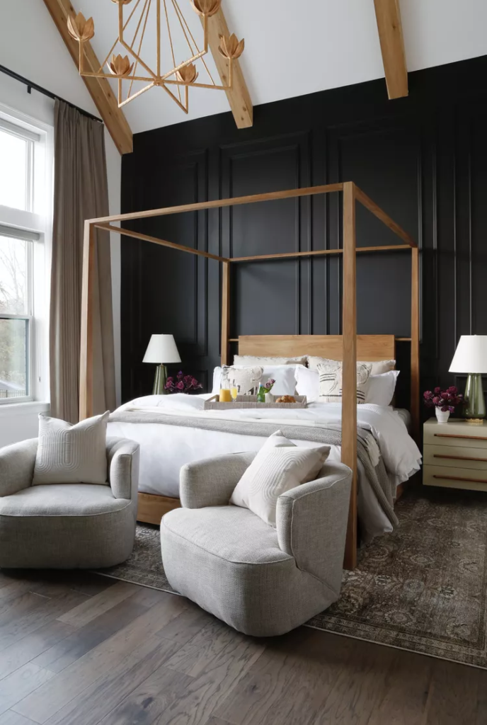 Carrie Livingston chose black walls for a bold, intimate look in this modern bedroom. Complementing the dark walls are white linens and additional seating, which together create a stylish and cohesive space.