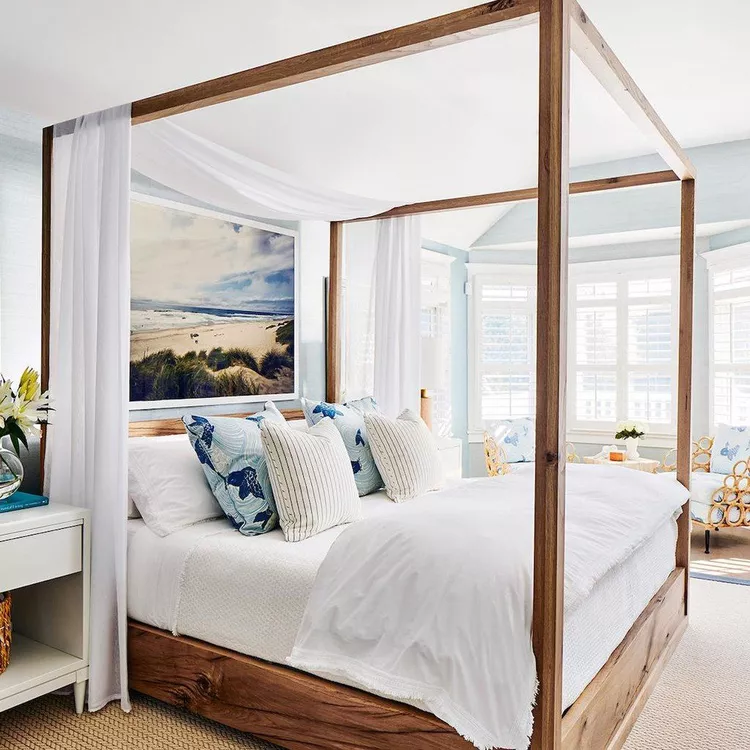 Kathy Kuo describes a canopy bed as one of the most romantic design elements. In this coastal beach house bedroom, the canopy bed serves as a focal point, with soft curtains and plush pillows that bring both elegance and comfort to the space.