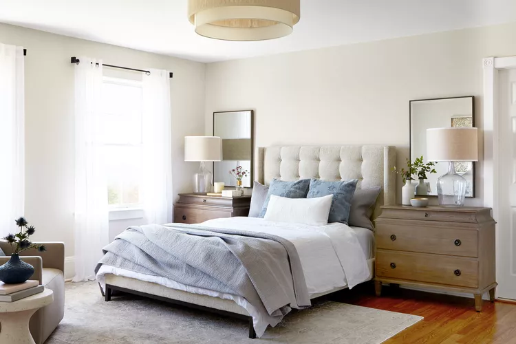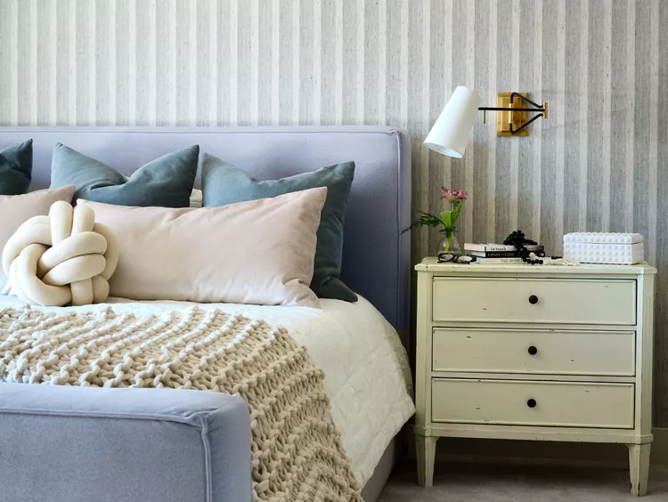 Ellie Lillstrom for Kirsten Conner Interior Design recommends using mismatched nightstands to reflect individual styles and needs. This approach adds a personalized touch and a more authentic feel compared to identical bedside tables.