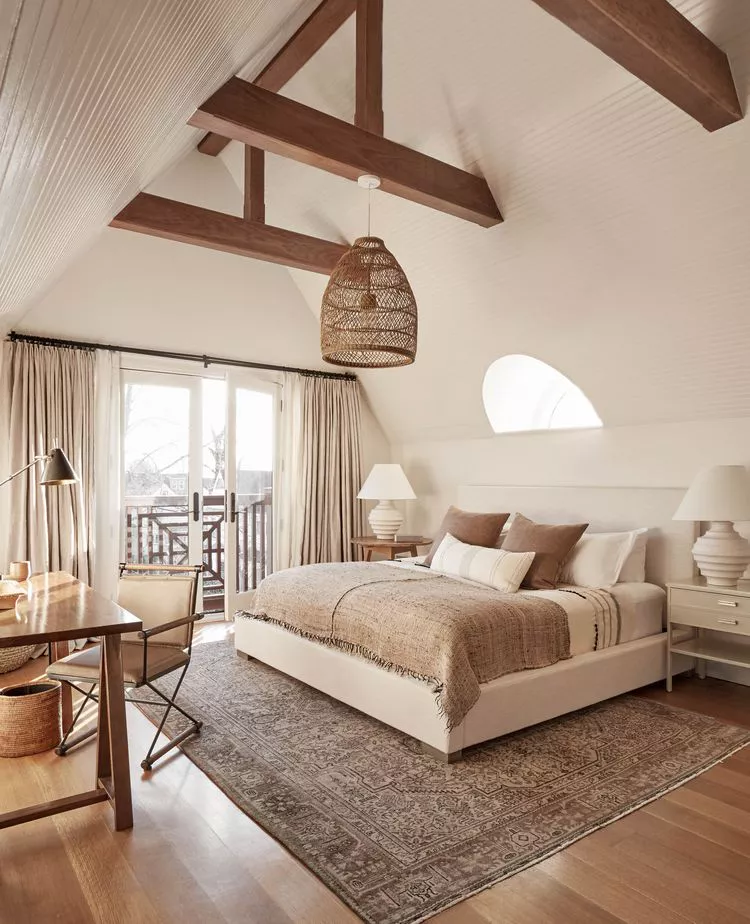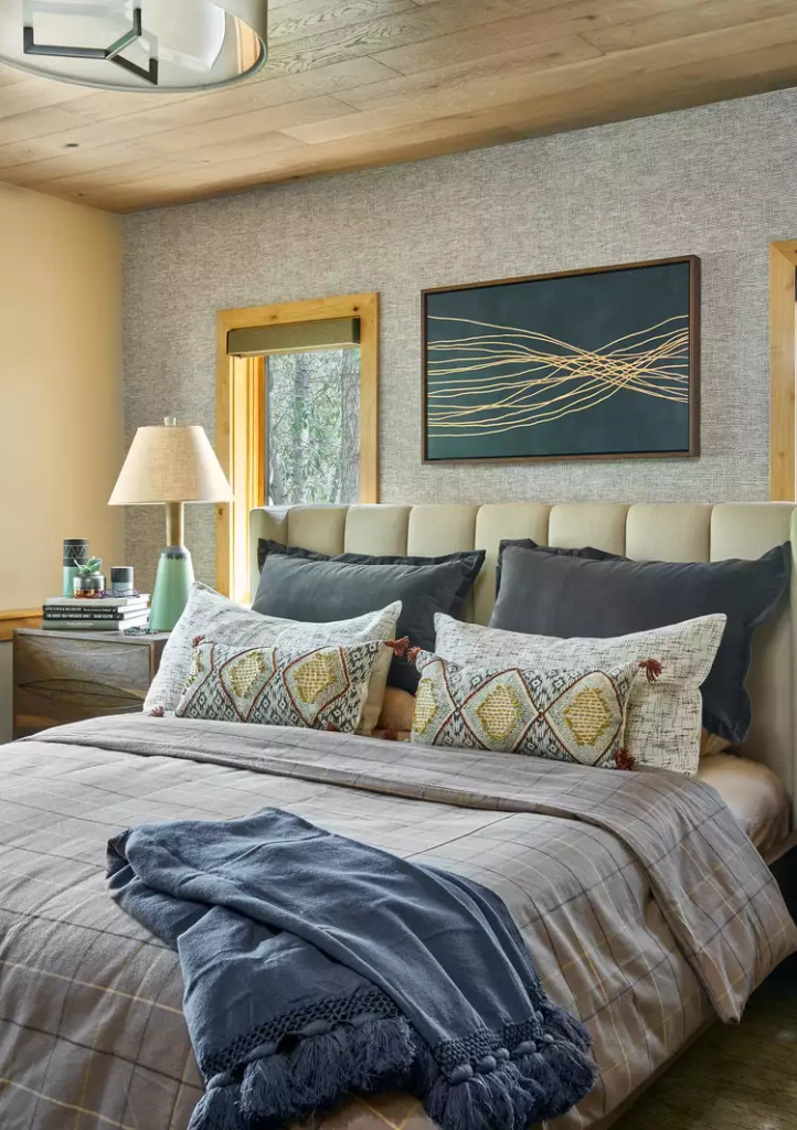 Erin Williamson Design emphasizes layering different textures and materials to create a cozy and inviting bedroom. By incorporating varied textures from floors to walls, this A-frame bedroom achieves a comfortable and stylish atmosphere.