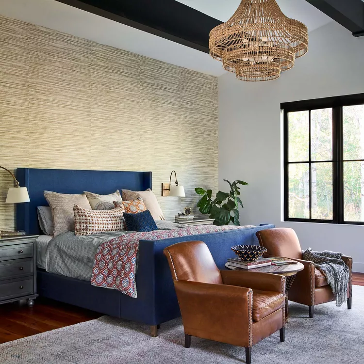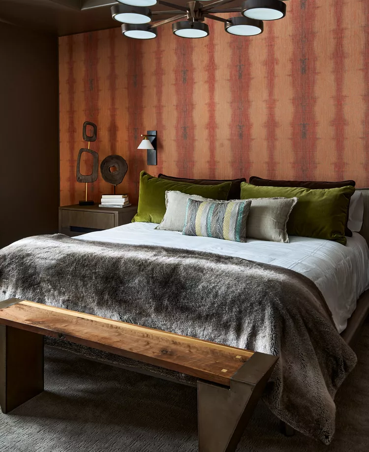 Rumor Designs suggests opting for textured wallpaper when it’s challenging to agree on patterns. This primary bedroom features a tactile accent wall that adds depth and interest without overwhelming the space.