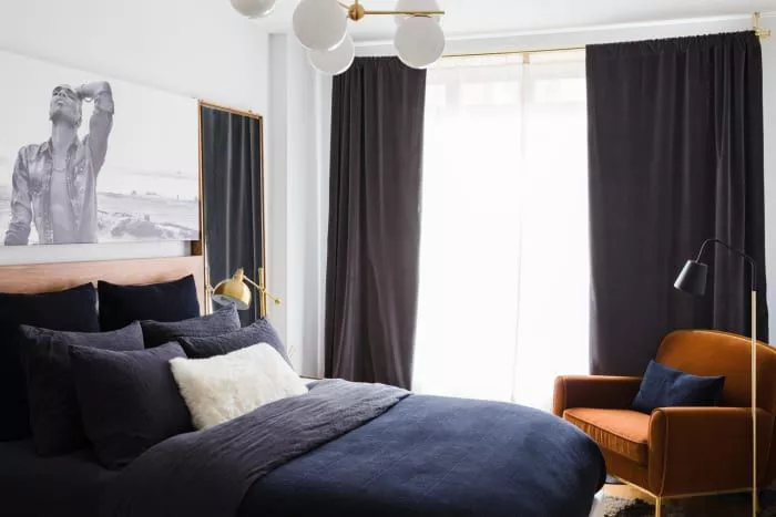 If you and your partner value complete darkness for better sleep, consider investing in blackout curtains. Travis Londons / Studio London designed these curtains to match the room’s bedding, providing both style and functionality while blocking out light and reducing noise.