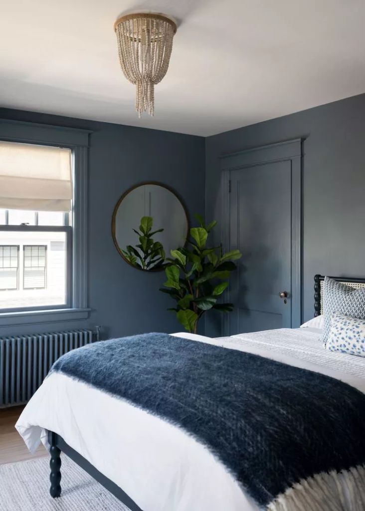 Choosing a deep blue paint color can be a win for both partners. Desiree Burns Interiors used a moody blue on walls, trim, and radiator, enveloping the room in a serene, calming hue that enhances the bedroom’s tranquil ambiance.
