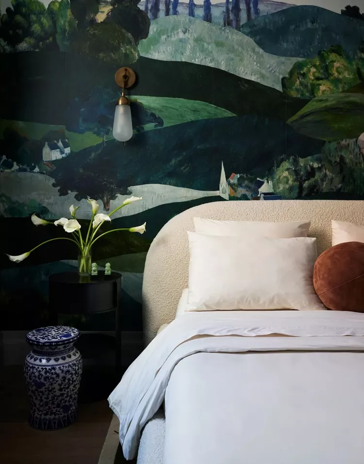 If choosing wall art proves difficult, a wallpaper mural can be a striking alternative. Alvin Wayne’s moody landscape mural sets a dramatic backdrop for the bed, complemented by a cream bouclé headboard that adds texture.