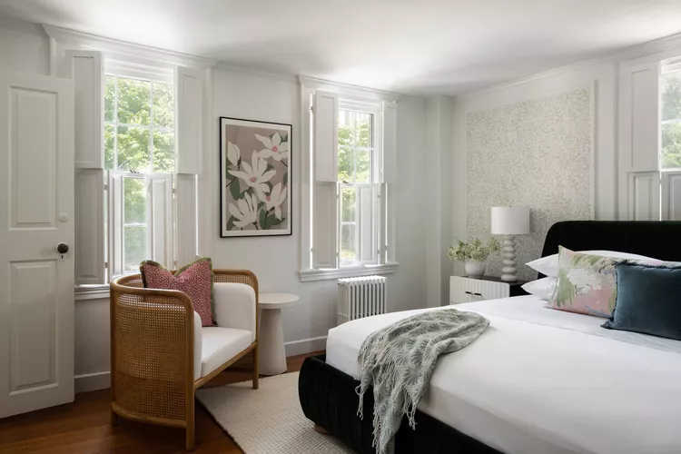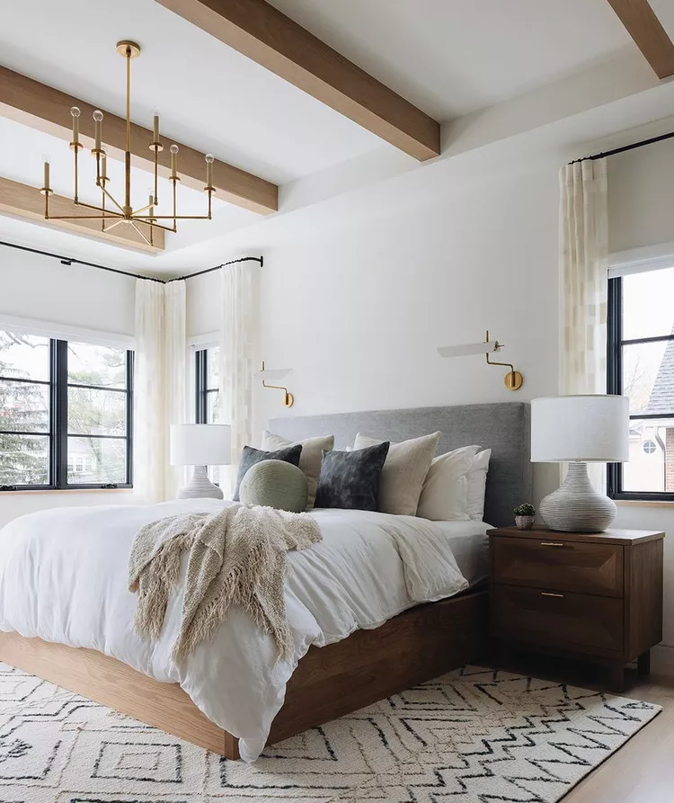 Kate Marker Interiors suggests adding a rug to soften hardwood floors and enhance the room’s comfort. A Moroccan-style rug provides texture and pattern, anchoring the bed and adding a cozy touch.