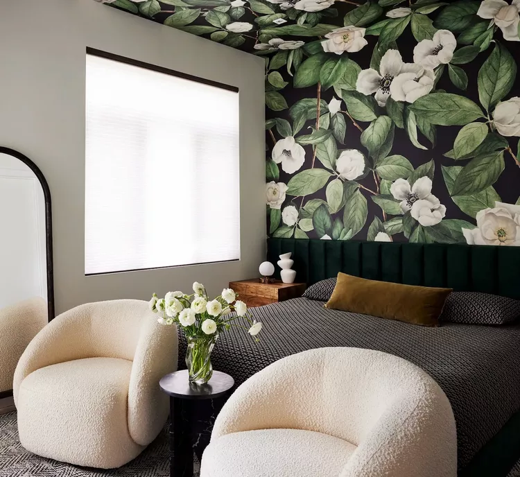Elevate your bedroom’s design with ceiling wallpaper. Alvin Wayne extended bold floral wallpaper from the walls to the ceiling, creating a dramatic and cohesive look that adds visual interest to the room.