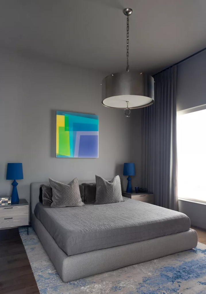 Mary Patton Design recommends painting both walls and ceiling in the same color for a cocoon-like effect. In this couples’ bedroom, a medium gray paint with bold accents adds depth and dimension, creating a cozy and cohesive space.
