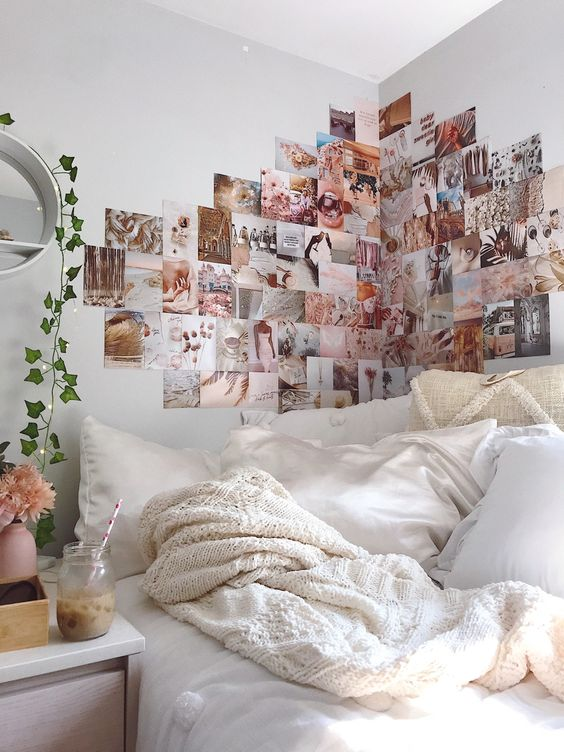 A pink aesthetic wall collage adds a soft and elegant touch to your bedroom. Photo collages in various shades of pink can create a harmonious and visually appealing arrangement. This design choice enhances the room’s elegance and allows for a personalized touch that matches your style.