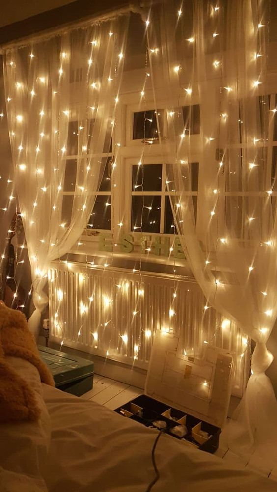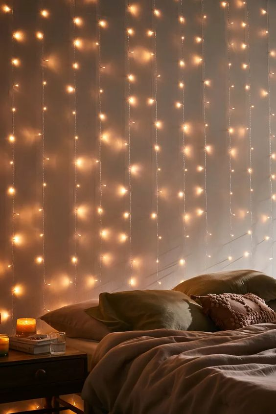 Curtain string lights provide a dreamy and elegant lighting solution for your bedroom. Draped along the curtain, these lights create a soft, ambient glow that elevates the room’s decor. The curtain string lights add a touch of sophistication and warmth, enhancing the overall aesthetic of the space.