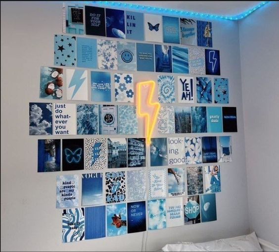 A blue wall collage kit offers a modern and refreshing option for decorating your bedroom. The various shades of blue create a cohesive and stylish look. This collage kit allows you to personalize the room’s ambiance with a color scheme that is both contemporary and calming.