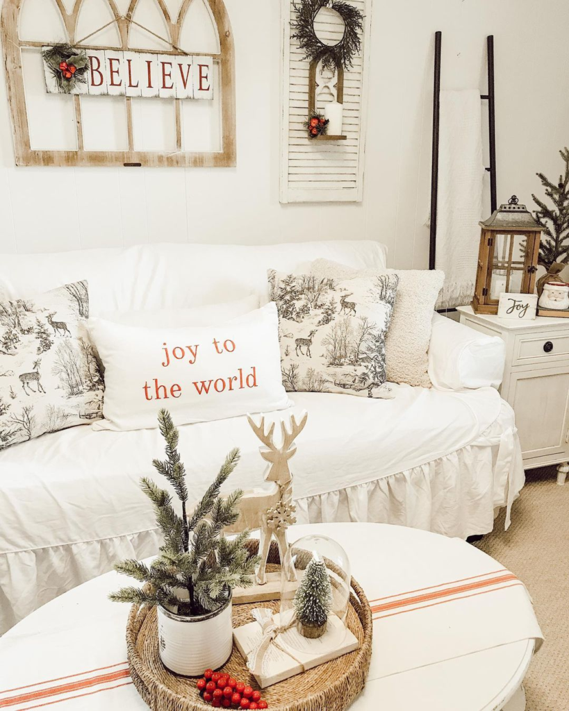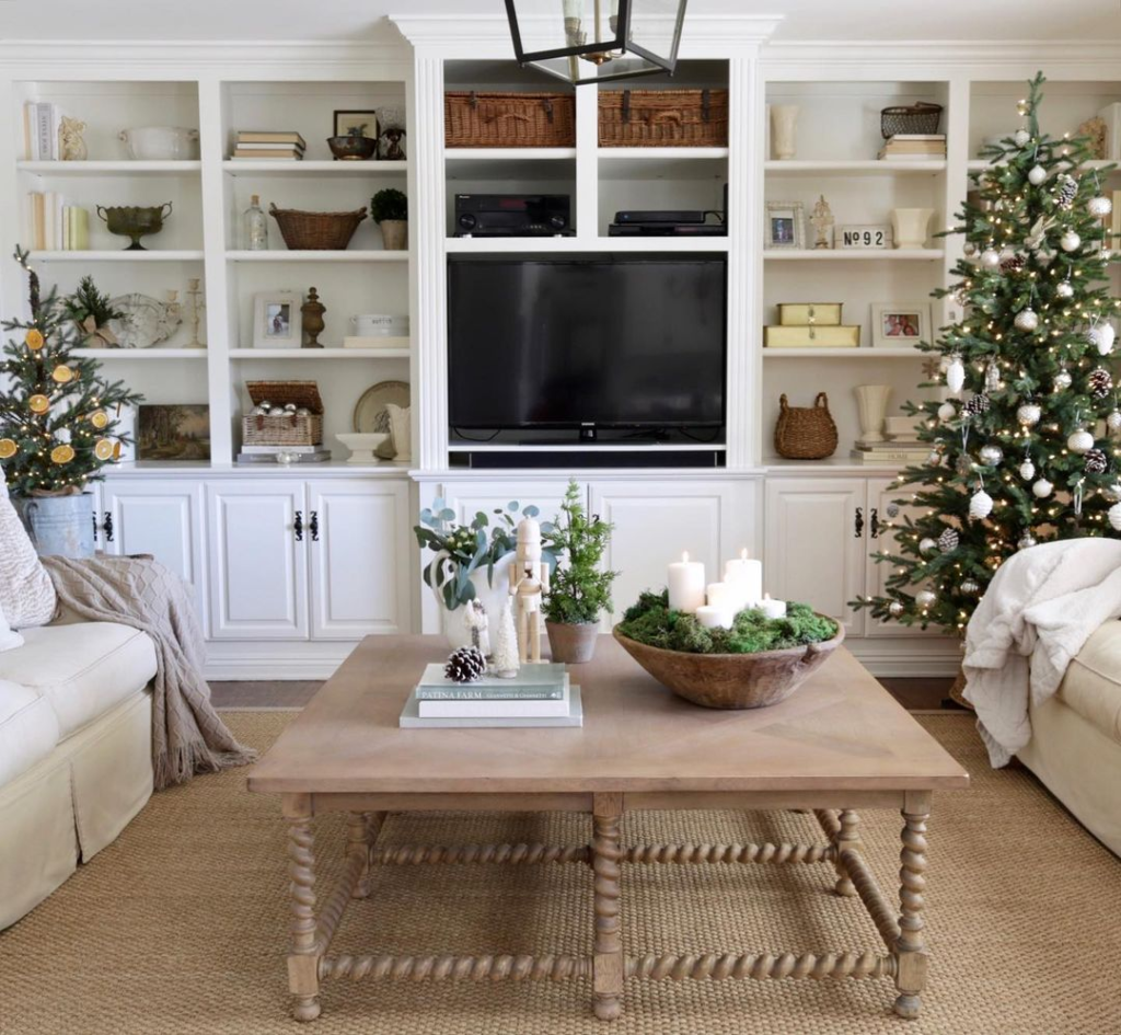 A round coffee table displays a basket filled with festive baubles and natural accents. The ‘Farm Fresh Christmas Trees’ pillow adds a quaint touch. This decor captures the warmth of farmhouse style during the holiday season, offering a cozy and nostalgically charming setting.