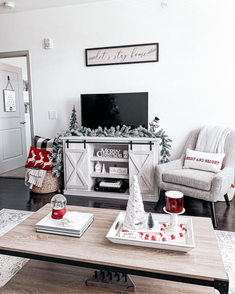 The coffee table centerpiece features a charming Christmas tree amidst a snowy scene displayed on the TV. Pinecones and a ‘MERRY’ sign add to the playful charm. This decor blends traditional and contemporary holiday motifs in a whimsical and joyful display.