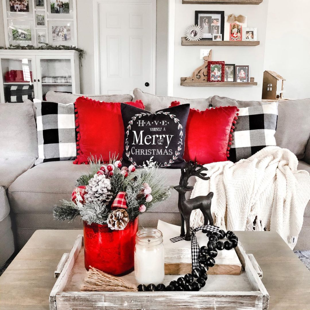 A vibrant red vase filled with winter foliage brightens a rustic tray, complemented by a candle and a reindeer figurine. The backdrop features chequered and ‘Merry Christmas’ pillows, creating a warm and inviting setting. This decor beautifully balances festive coziness with homey charm.