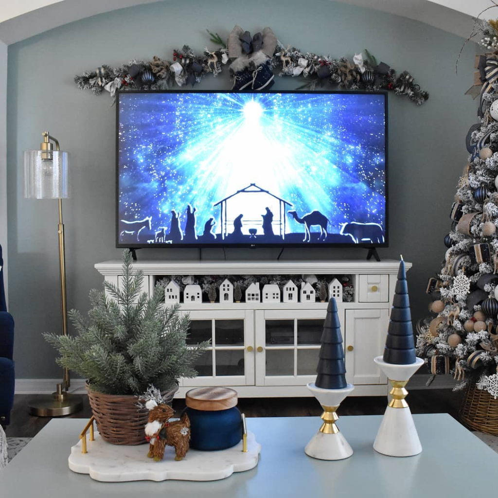 A serene nativity scene is set against a starry night backdrop displayed on the TV. Chic blue trees stand nearby, while a plush reindeer toy adds a soft touch to the scene. This modern take on the classic nativity story offers a peaceful and contemporary Christmas decoration.