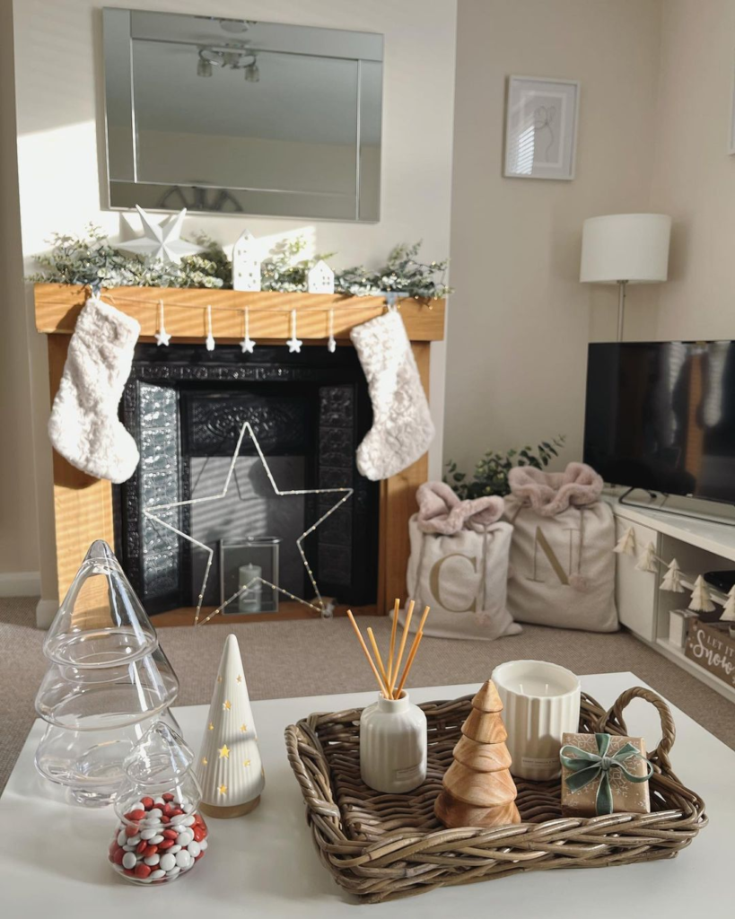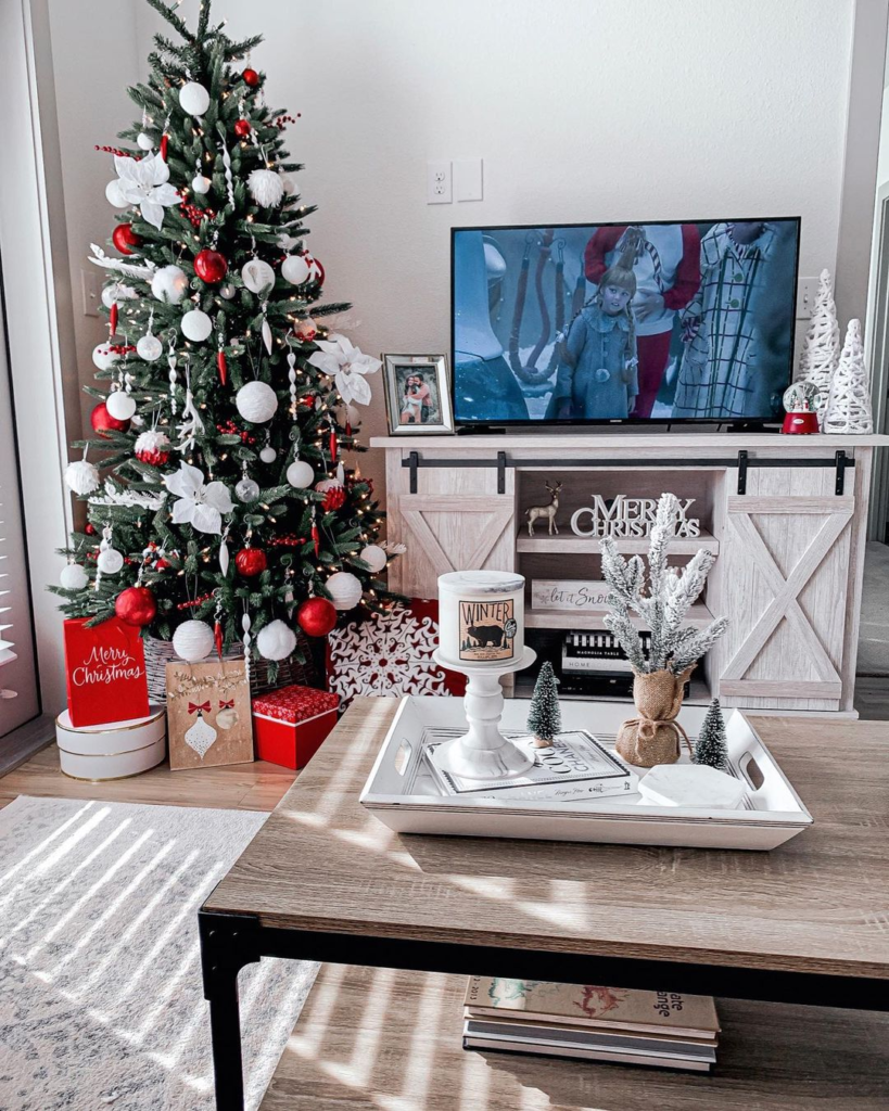 The corner of the room boasts a bright Christmas tree, complementing a tray on the coffee table filled with festive trinkets. A ‘Merry Christmas’ tin and a cozy candle invite holiday cheer. Snow-white decor pieces enhance the joyful ambiance, capturing the excitement of Christmas morning.