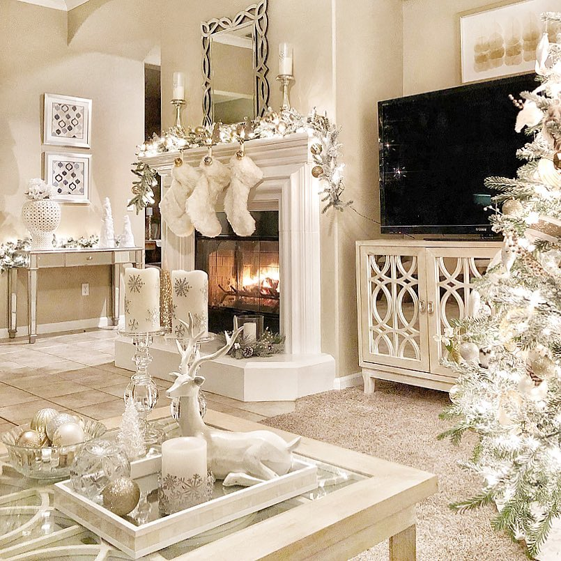 On a glass coffee table, silver and white create a dazzling winter wonderland. A mirrored tray reflects the soft candlelight, while delicate reindeer and baubles contribute to the magical atmosphere. This elegant display is perfect for a sophisticated Christmas evening.