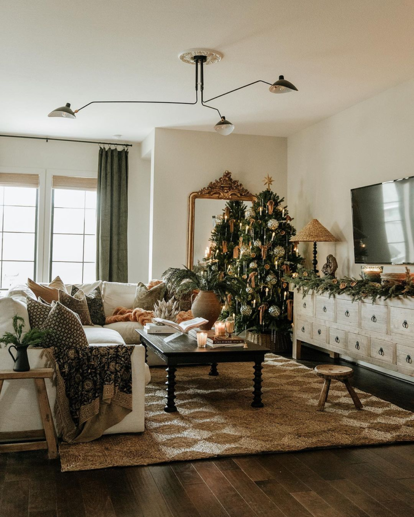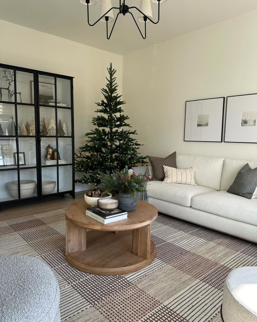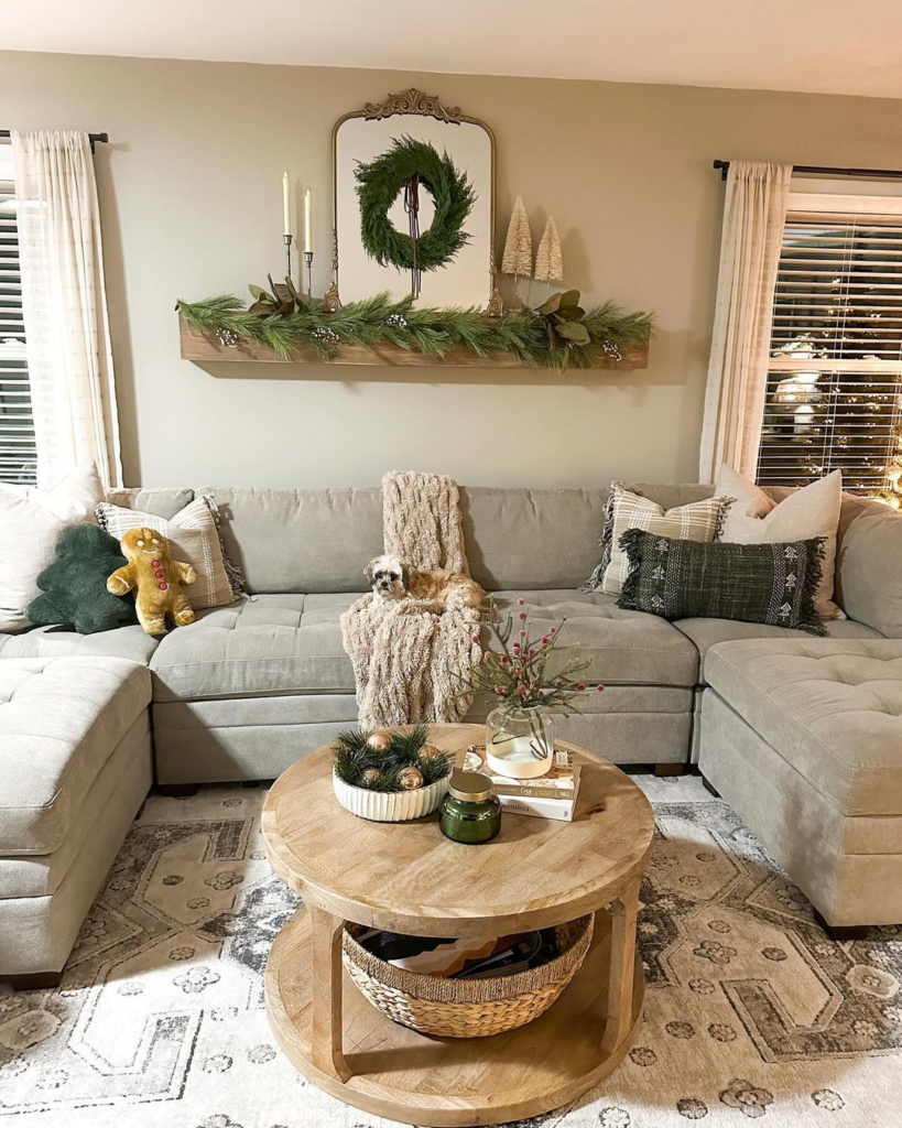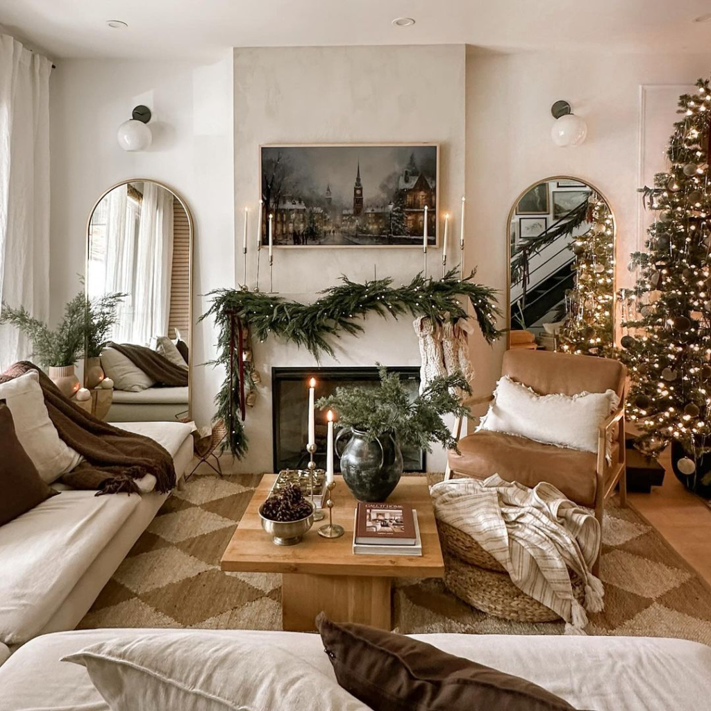 A coffee table at the center of the room is adorned with a candle and seasonal greenery. The room’s muted tones enhance the warm ambiance. This decor combines traditional Christmas warmth with contemporary design, creating an inviting space for holiday gatherings.