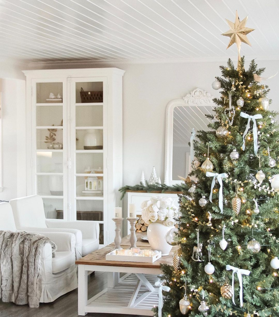 A white coffee table with a minimal candle arrangement complements the serene decor of the room. A white star on the nearby tree echoes the table’s peaceful vibe. This decor embodies a quiet, snowy Christmas charm, celebrating the season with simplicity and tranquility.
